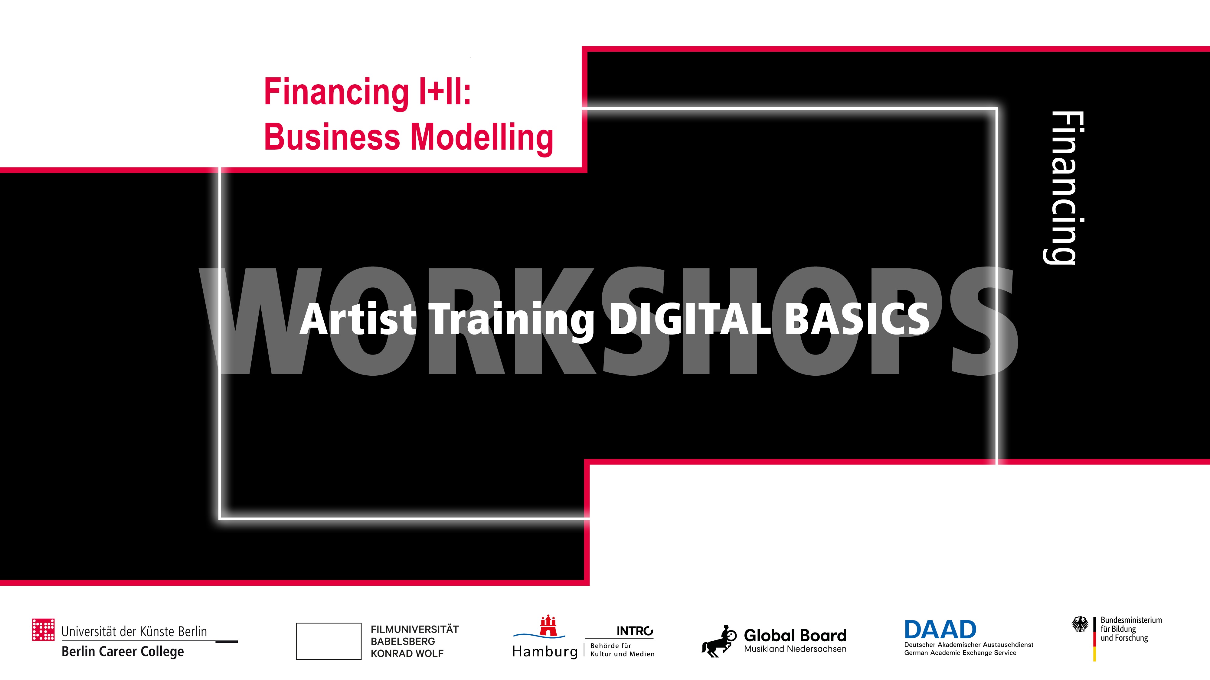 The project Artist Training DIGITAL BASICS is offered by the UdK Berlin Career College and is funded by the DAAD and Federal Ministry of Education and Research (BMBF). In cooperation with the Film University Babelsberg KONRAD WOLF, the Global Board at Landesmusik-akademie und Musikland Niedersachsen GmbH, and INTRO of the Ministry of Culture and Media Hamburg.